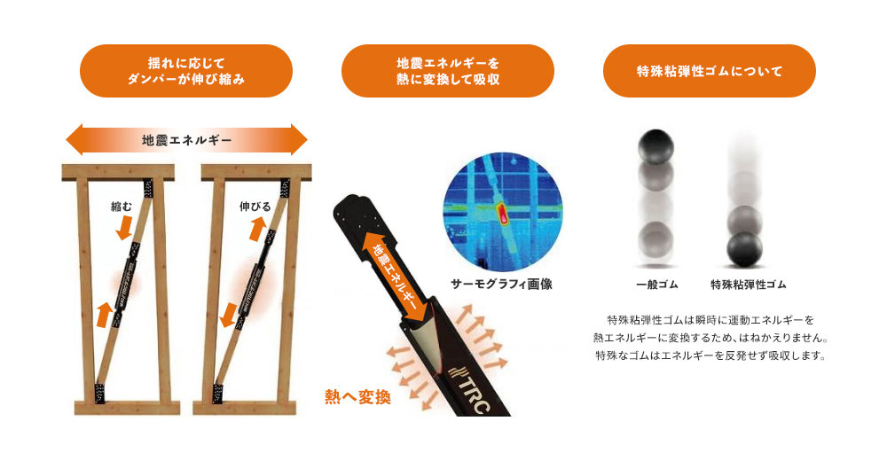 TRCダンパーは、地震エネルギーを揺れに応じて吸収。そのエネルギーを熱に変えて放出する、特殊なゴムを内蔵しています。