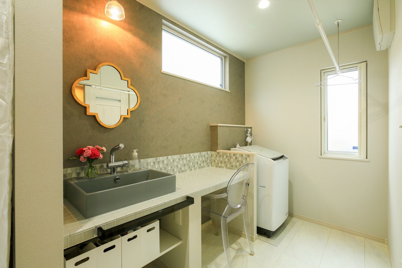 「造作洗面です。家全体の色合いや素材感、それに合わせた家具の統一感にこだわりました。
