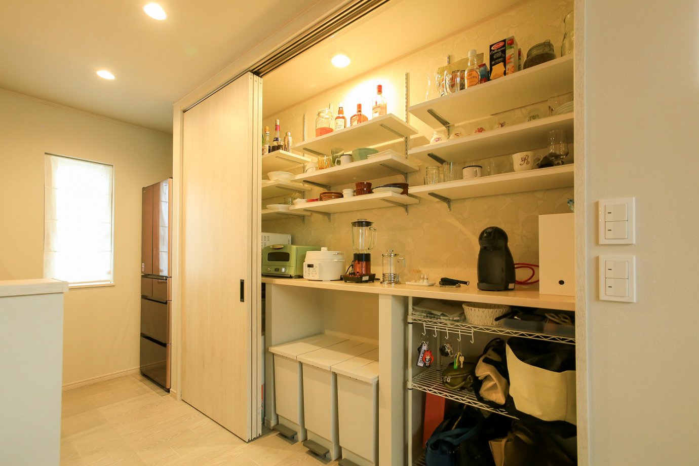 キッチン後ろの壁面収納には扉をつけて隠せる収納に。中に可動棚をつけることによって収納力を上げ、自分の好きなように配置できるのも嬉しいポイントです。