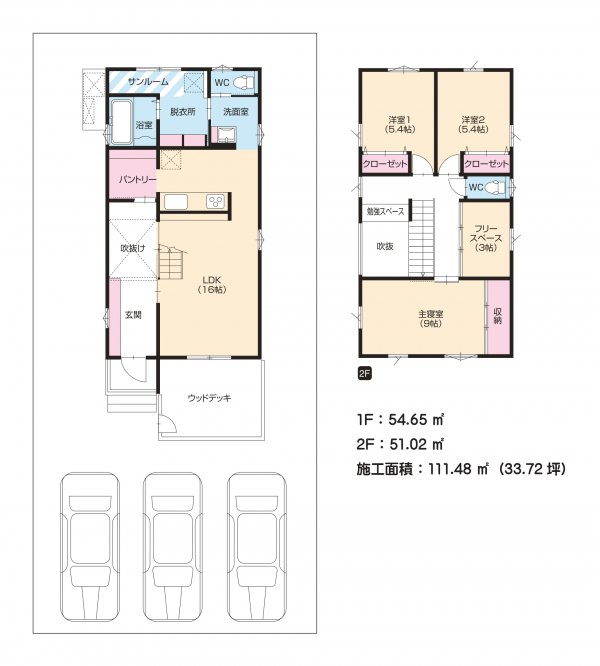 家事動線もしっかり考えられた大容量のパントリー。忙しい毎日を助けてくれる1箇所にまとめられた水まわり。パントリーに、サンルームと収納も兼ねた脱衣スペース。2階にも何度スペースに広々クローゼットと収納が多いのも魅力の1つ。