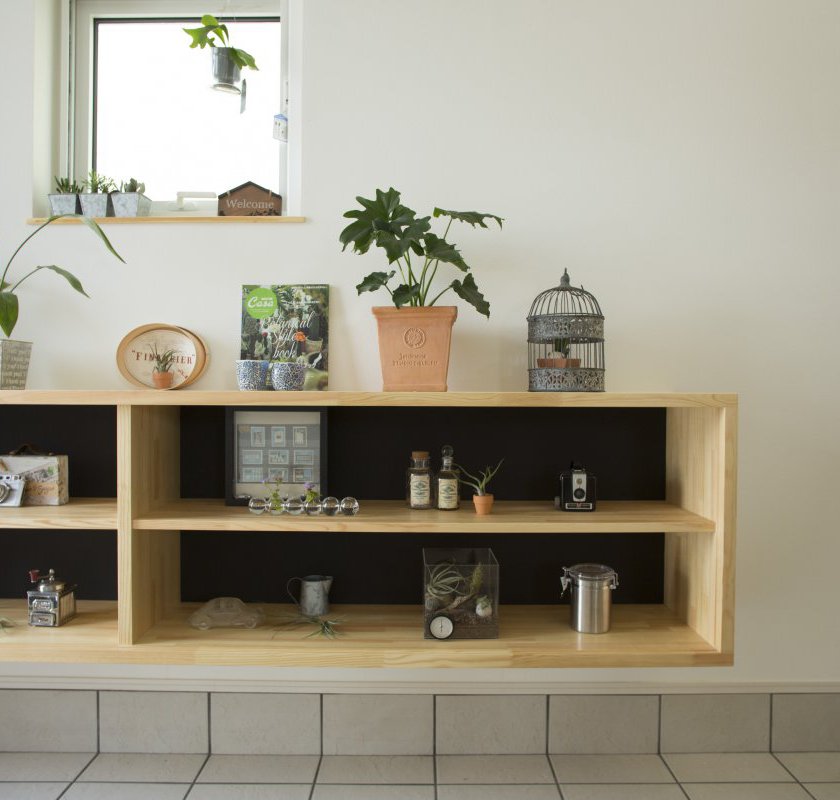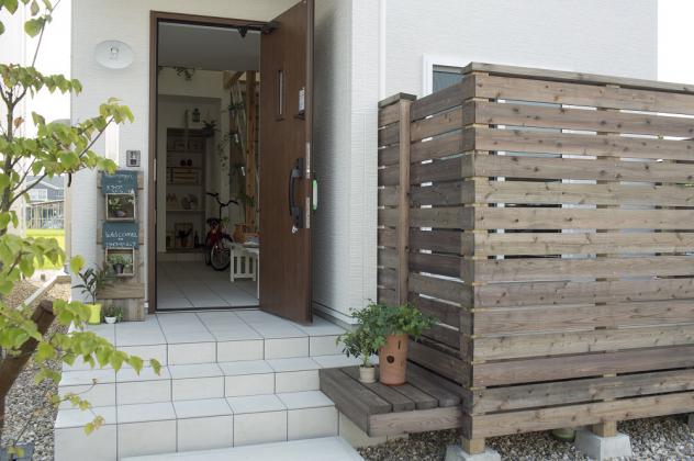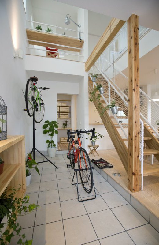 緑と調和するナチュラルな色使いの玄関には大好きなインテリアグリーンを飾りました。玄関からすぐのリビング階段は2階と自然につながり「ただいま」も「おかえり」の声が弾みます。広めに設けたスペースにはアウトドアな趣味との相性もピッタリ。