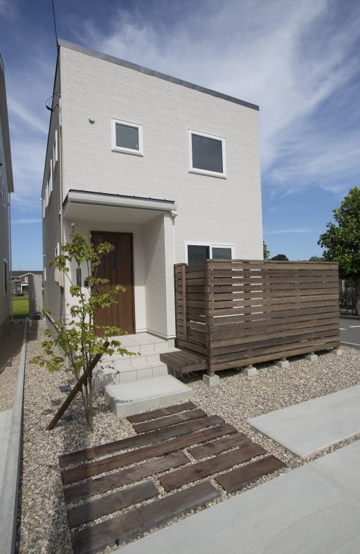 外観はスタイリッシュな箱型をベースに白を基調にシンプルに落とし込みました。お家のイメージは建物そのものだけではなく、玄関までのアプローチも重要です。T様邸では、すっきりとした外観が映えるようシンボルツリーとアプローチに工夫を。