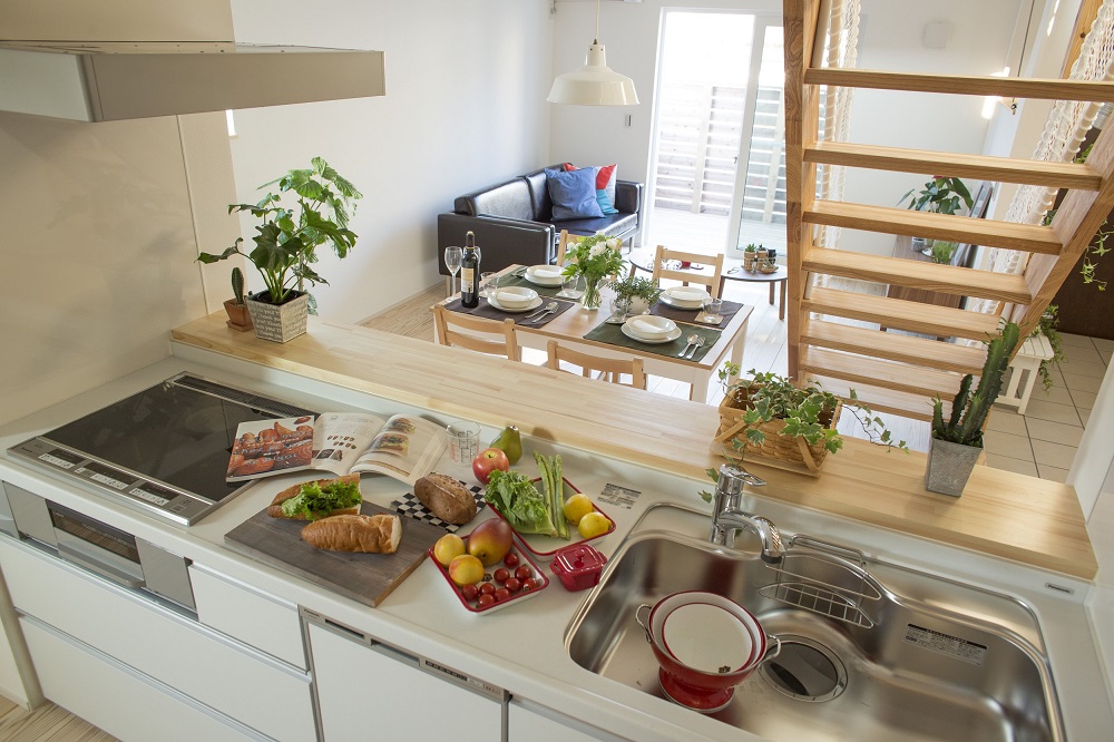 家族の暮らしの中心となるLDKはホワイト系の内装デザインと自然素材の温もりが特徴的。「キッチンに立っていても、テレビを見ていても家族と会話をしながら過ごす時間が大好きです。」とT様。