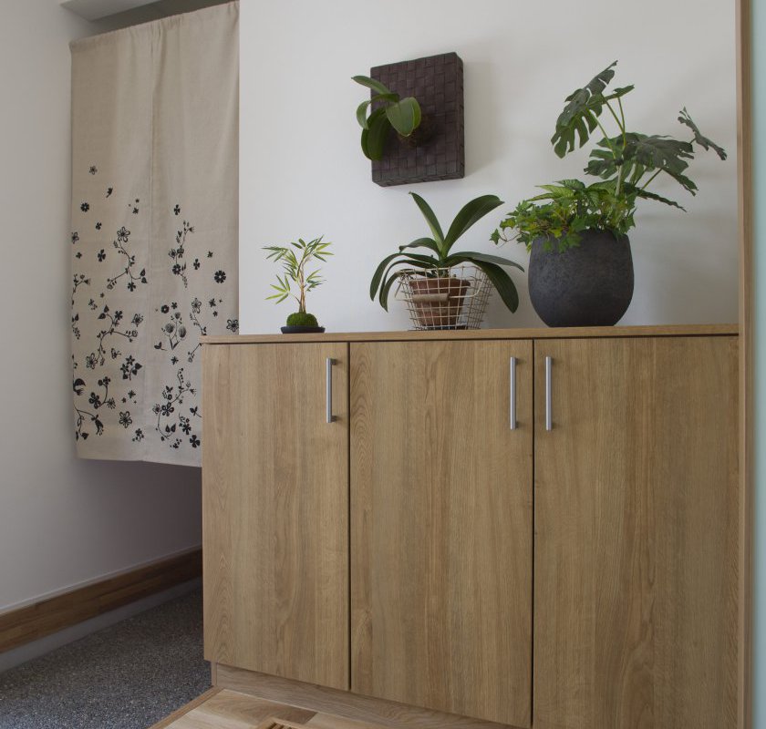広々開放感のある玄関に、普段はく靴は下足箱に。のれんをくぐれば大容量の収納庫があります。季節ものや長靴。お父さんのゴルフバックやお子さんのスキー板やボード。小さいお子さんの間はベビーカーや三輪車まで収納。