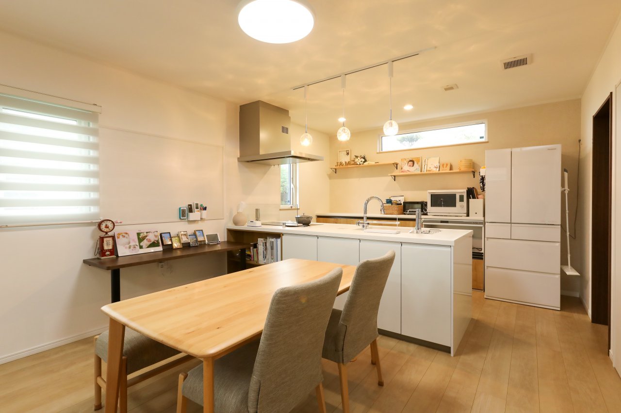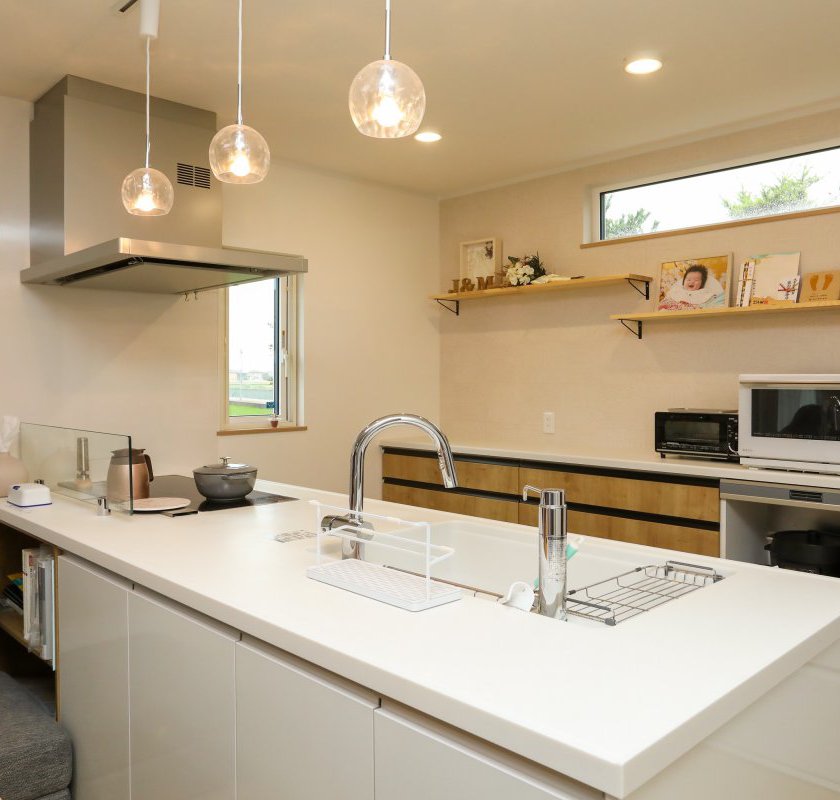 キッチンです。広く使いやすくを意識して、料理している時でも全体を見渡せるようにしたかったのでフルフラットにしました。あとダイニング側で収納ができるようにしたのもこだわりです。