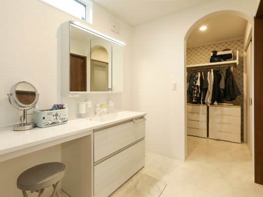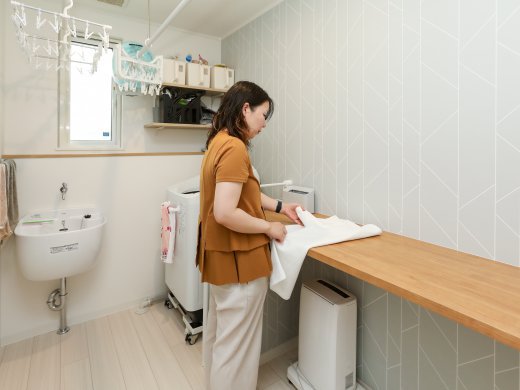あとは動線にこだわったのと、収納もたくさん作りました。家事動線はすごく使いやすいです。洗濯して干して乾いたらそのまま畳まずにファミクロに片付けられます。カウンターもあるからちょっと畳むのも出来きますし、洗濯機から直接干せるのはすごく楽です。