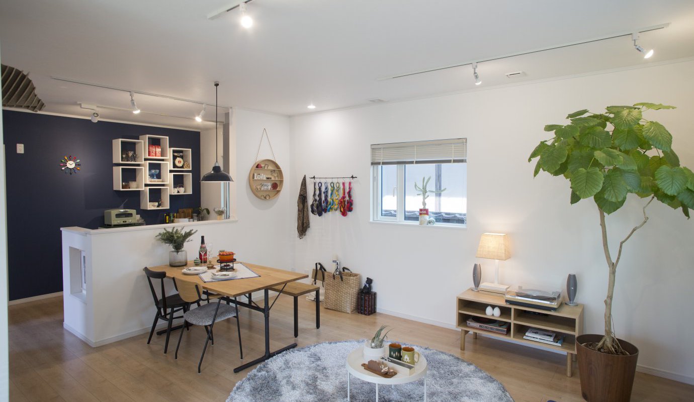 キッチンはネイビーの壁とフレーム型の棚によりオシャレな印象に。